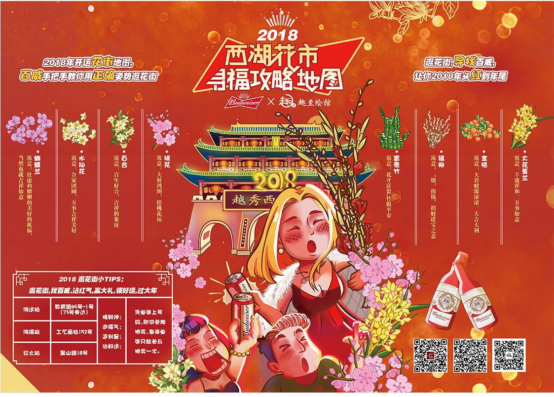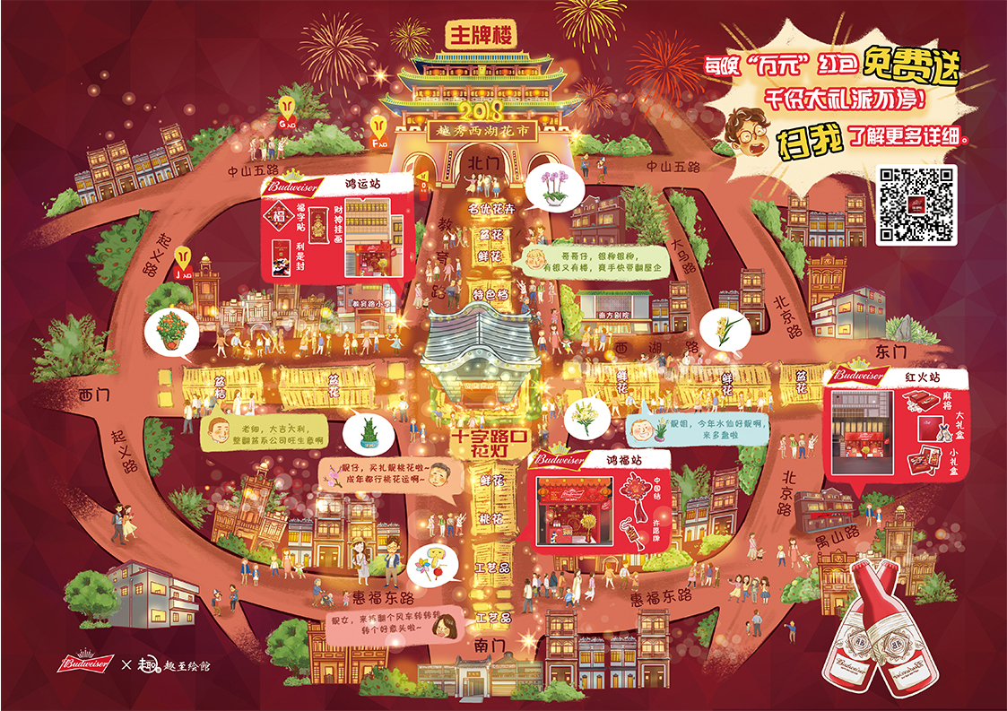 除此之外,百威对于365在线体育投注官网文化的插画赞不绝口,并在2月底广州迎春西湖花市还展出了双 方合作的地图及多款延伸画面。